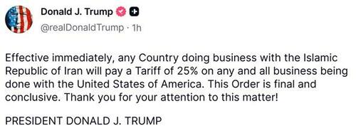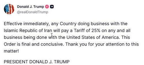 - Trump Imposes 25% Tariff On Any Country Doing Business With Iran “Effective Immediately”by Tyler Durden on January 12, 2026 at 11:23 pm